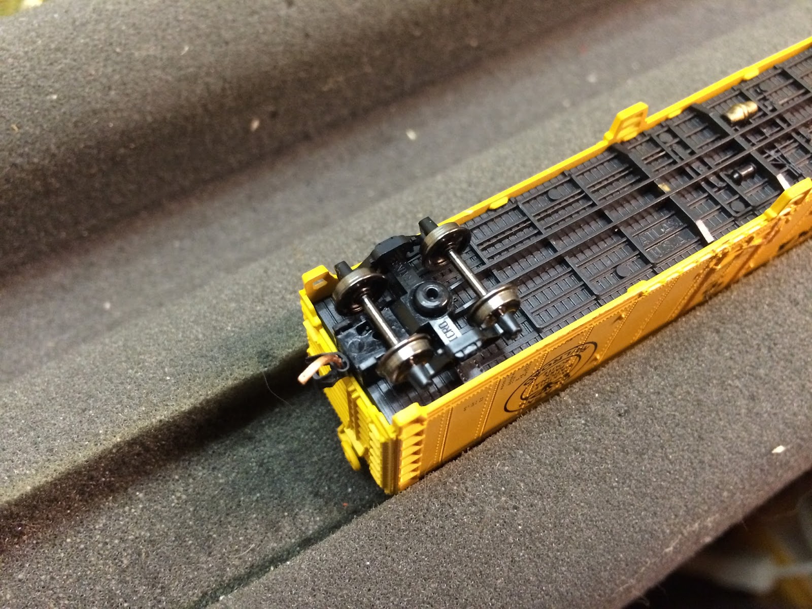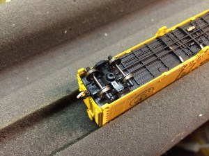 I upgraded the trucks on my reefer. I removed the stock trucks and installed Micro-Trains Bettendorf trucks with short extension couplers. (PN# Micro-Trains N 00302021). I also replaced the plastic wheels, which come stock on the trucks, with BLMA N PN# 9810 33″ precision metal wheels.